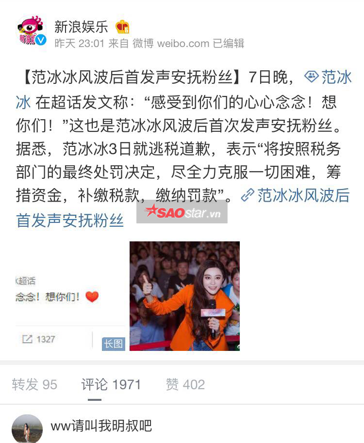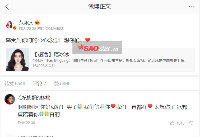 Được biết, Phạm Băng Băng chỉ bày tỏ nỗi lòng của mình với fan tại bài đăng trên siêu chủ đề từ khoá tên của Weibo, nơi tập trung toàn bộ fan hâm mộ, fandom của Phạm Gia tại Trung Quốc. Bài đăng này không kết nối trên trang cá nhân của Băng Phạm do đó trên trang chủ chính sẽ không hiển thị bài viết này và những người follow cô cũng không biết đến sự tồn tại của nó, chỉ khi “click” vào siêu từ khoá Phạm Băng Băng.
