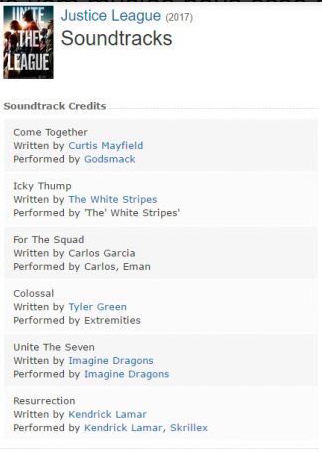 Danh sách bài hát đã được xuất hiện trên trang Justice League IMDb nhưng nhanh chóng bị xóa khỏi. Tuy nhiên, nếu là fan của Justice League theo dõi thông tin mỗi ngày và cũng như fan Imagine Dragons - nhóm nhạc sẽ thể hiện ca khúc Unite The Seven thì đã nhanh chóng chụp lại màn hình của danh sách và đăng công khai. Theo danh sách này, Imagine Dragons đã thu âm một bài hát cho bộ phim là Unite the Seven, điều này có ý nghĩa rất có thể Green Lantern sẽ góp mặt trong Justice League.