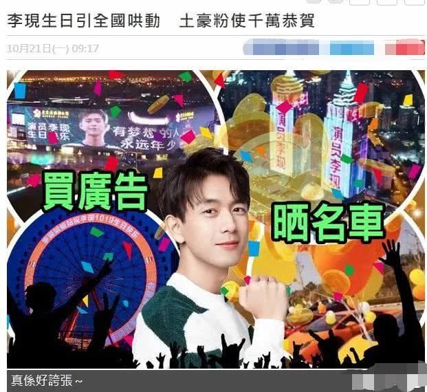 Có fan gởi lời chúc mừng sinh nhật, cũng có lượng lớn người hâm mộ chi rất nhiều tiền. Không những bỏ tiền mua quảng cáo trên đường sắt, xe công cộng… mà có người còn bỏ ra 28 chiếc xe, bao gồm cả Porsche để xếp hai chữ cái LX (Tên phiên âm tiếng Trung của Lý Hiện) trên khoảng đất trống.