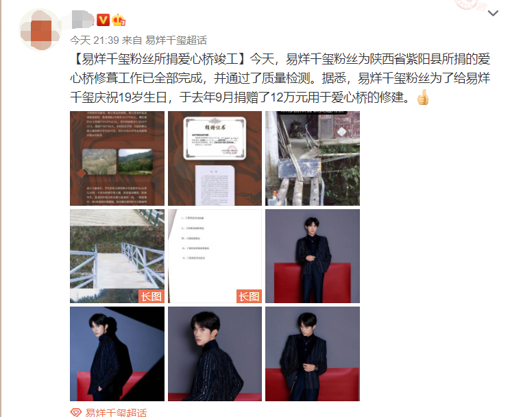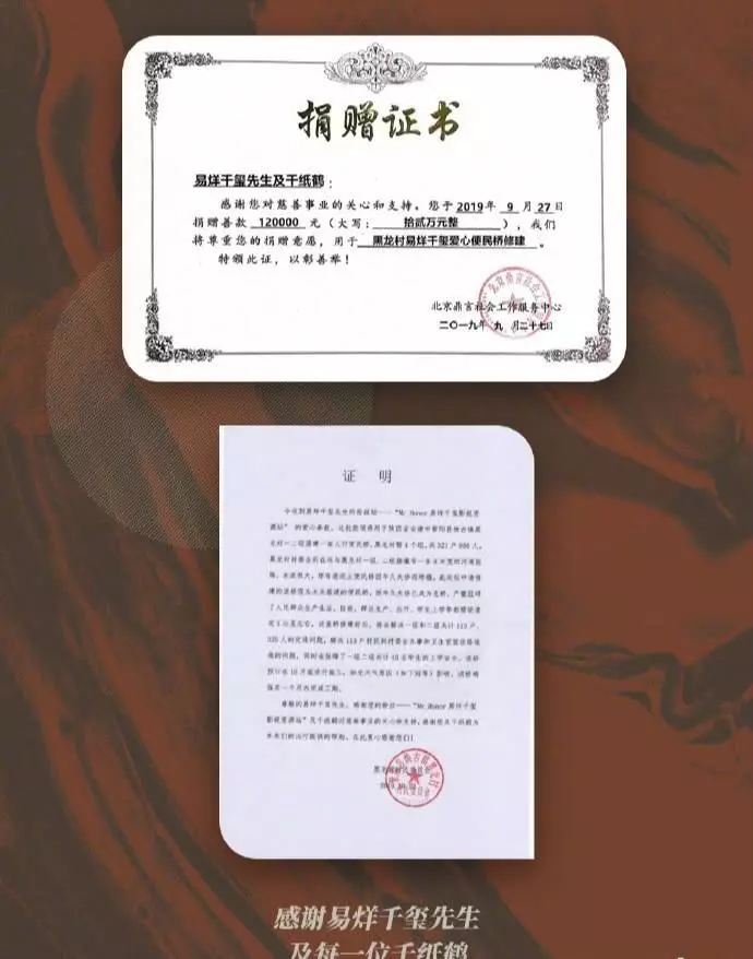 Không chỉ quyên góp xây dựng nên chiếc cầu, trước đó fandom của Dịch Dương Thiên Tỉ còn quyên tặng cả trường tiểu học, nhà ăn, ký túc xá,… Hoạt động thiện nguyện, công ích của tập thể này rất nhiều, khiến nhiều người vô cùng cảm kích.