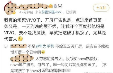 “VIVO thật sự là phiền chết rồi. Quảng cáo đầu nào cũng vậy, mở ra là từ trang đầu đã có, từ sáng đến tối có phiền không hả? Đến cả Baidu của tôi cũng là VIVO. Nếu không phải tôi không có tiền sớm đã đổi cái điện thoại nát này rồi, đặc biệt là người đại diện”. (Người đại diện VIVO là Thái Từ Khôn)