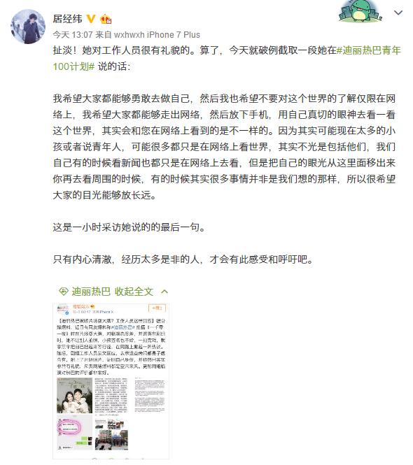 Sau một giờ phỏng vấn, câu cuối cùng Địch Lệ Nhiệt Ba nói rằng: “Tôi hi vọng tất cả mọi người đều có thể dũng cảm làm chính mình, tiếp đó tôi hi vọng những hiểu biết của mọi người về thế giới này không chỉ hạn chế ở mạng internet. Tôi hi vọng mọi người có thể thoát ra khỏi mạng internet, sau đó đặt điện thoại xuống, dùng ánh mắt thiết thực của mình để nhìn thế giới này, thực tế sẽ không giống những gì bạn thấy trên mạng internet.