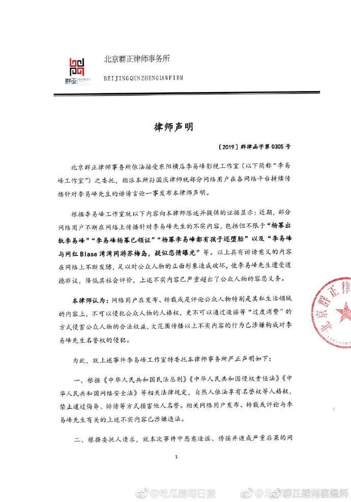 Ngày hôm qua phía luật sư Lý Dịch Phong cũng đã lên tiếng thanh minh cho biết: “'Dương Mịch ngoại tình Lý Dịch Phong', 'Lý Dịch Phong và Dương Mịch đã lĩnh chứng kết hôn', 'Lý Dịch Phong cùng với hotgirl mạng Blase đi du lịch đảo Koh Samui Thái Lan, nghi vấn cả hai đang hẹn hò với nhau' …. tất cả đều là những tin đồn bịa đặt, đối với những tin đồn ác ý này vi phạm đến quyền danh dự của Lý Dịch Phong nên những cá nhân trên mạng nào tung tin đồn tạo thành hậu quả nghiêm trọng sẽ bị khởi tố”.