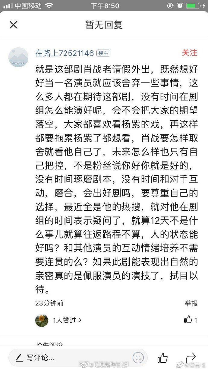 Mới đây, fan Dương Tử bắt đầu chỉ trích nam chính Tiêu Chiến của phim khi cho rằng anh là một diễn viên thì nên học cách từ bỏ một số việc. Suốt ngày, anh chàng ở bên ngoài xin nghỉ phép làm liên lụy đến Dương Tử. Thậm chí còn có người liệt kê thời gian Tiêu Chiến nghỉ là 19 ngày. Có điều, ngay sau đó fan Tiêu Chiến cũng lên tiếng làm rõ nói Tiêu Chiến mỗi lần quay phim xong đều ngồi máy bay đến đỏ mắt.