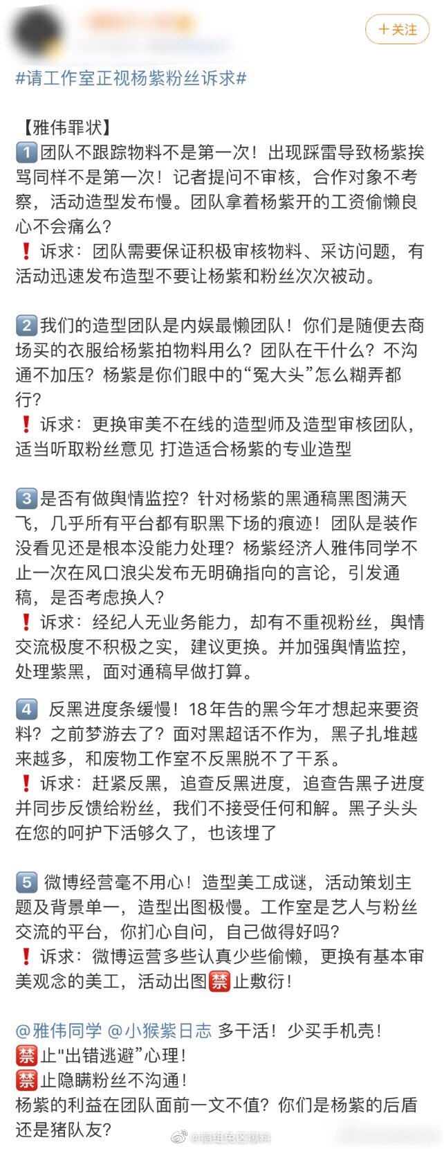 Mới đây, fan Dương Tử chỉ trích phòng làm việc và người quản lý, cho rằng họ không làm tốt công việc của mình, khiến nàng tiểu hoa bị mắng chửi, bị réo tên vào những chuyện không đâu. Với fan hâm mộ, Dương Tử vốn rất đẹp nhưng tạo hình của cô cứ lặp đi lặp lại gây nhàm chán, đồng thời chất vấn phòng làm việc rốt cuộc là hậu thuẫn của Dương Tử hay đầu óc cặn bã, ngu ngốc? Xem ra nỗi niềm của fan hâm mộ ức chế cách làm của phòng làm việc không phải ngày một ngày hai.