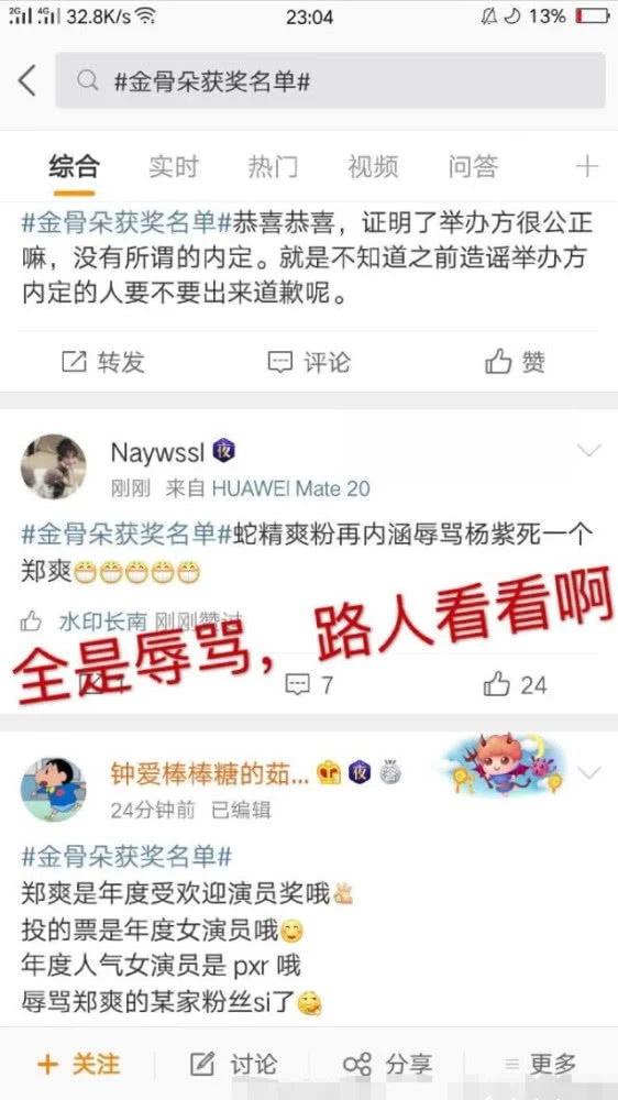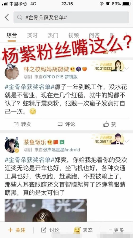 Thế nhưng, giải thưởng này bị fan Dương Tử nghi ngờ là ban tổ chức đã định sẵn: “Trịnh Sảng nhận được giải thưởng này cũng chẳng có thực lực gì làm người khác tin tưởng“. Ngoài ra, fan nhà Dương Tử còn mắng Trịnh Sảng là nữ xà tinh tác quái, sao tác… lấy phẫu thuật thẩm mỹ để công kích. Sau đó, người hâm mộ Trịnh Sảng tức giận phản pháo, cho rằng phía Dương Tử xấu xí mua thủy quân. Hiện tại fan hai nhà đang chỉ trích lẫn nhau, chưa có dấu hiệu dừng “cuộc chiến”.