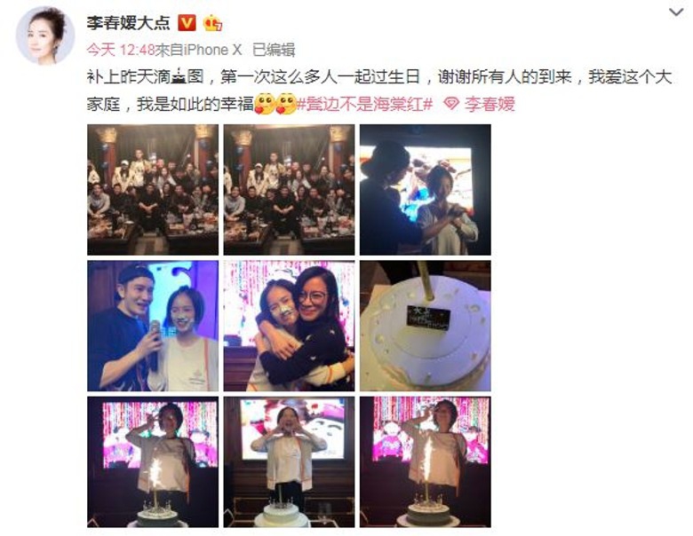 Trên Weibo, Lý Xuân Ái bày tỏ sự biết ơn đến những người bạn thân thiết đã dự tiệc sinh nhật: “Đã hoàn thành đêm sinh nhật đáng nhớ, lần đầu tiên có nhiều người dự tiệc sinh nhật đến vậy. Xin cảm ơn vì đã đến bên tôi, tôi yêu gia đình lớn này, tôi thực sự rất hạnh phúc”.