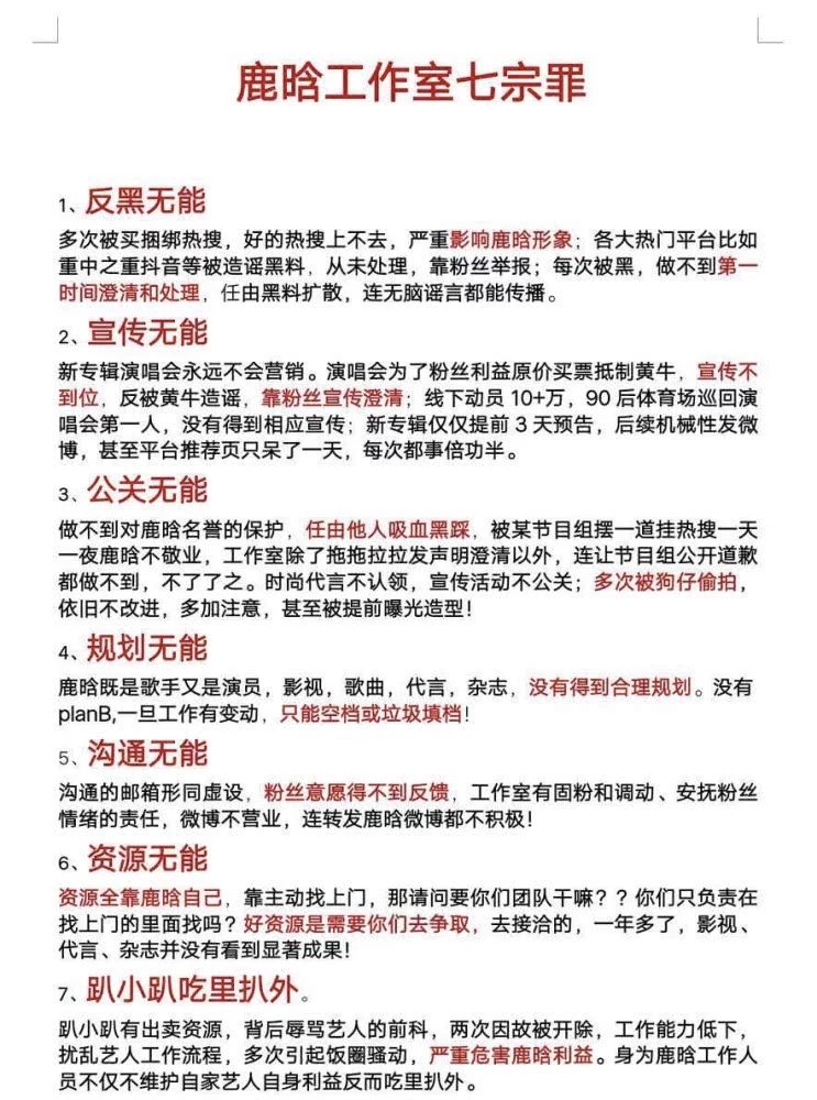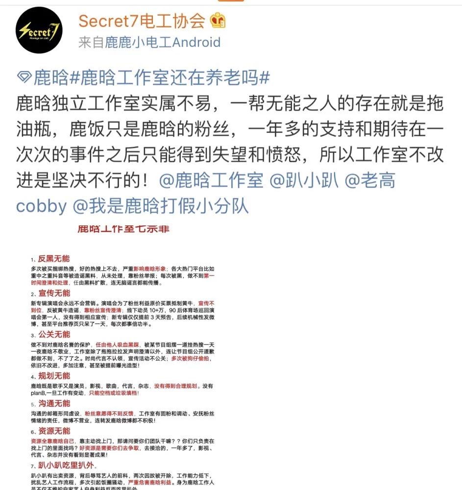 Fan hâm mộ Lộc Hàm cho rằng studio đã quá vô dụng ở rất nhiều phương diện, ví dụ như trong việc phản hắc, tuyên truyền… cảm thấy studio của Lộc Hàm không hề kịp thời xử lý những tin tức tiêu cực liên quan đến anh, cũng như không tích cực tuyên truyền. Về sau, đoàn đội còn vô năng trong các mặt giao tiếp, tài nguyên… Thế nhưng, tại sao fan của Lộc Hàm giận studio lâu như vậy nhưng đến hôm nay mới bộc phát cơ chứ?