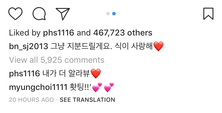 Để phản hồi lại cậu em thân thiết, Park Seo Joon liền trả lời: “Anh sẽ chia em ít cổ phần. Anh yêu em, Sikkie”. Ngay sau đó, Park Hyung Sik bình luận vào bài đăng của nam diễn viên: “Em yêu anh nhiều hơn cơ”.
