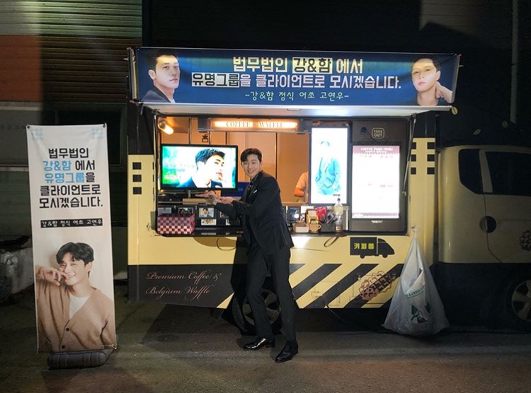 Lời nhắn nhủ của diễn viên Cô nàng mạnh mẽ được ghi ở trên banner đặt bên hông và trên đầu của chiếc xe tải: “Văn phòng luật sư Kang & Ham kính mời! Thân chủ pháp lý, tập đoàn Yoo danh tiếng. Xin mời đến quầy phục vụ Kang & Ham”.