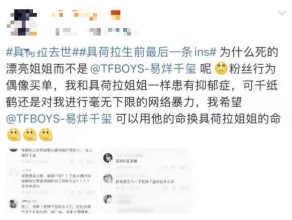 “Tại sao chị gái xinh đẹp ch.ết mà không phải là @TFBoys Dịch Dương Thiên Tỉ? Hành vi mua số liệu cho thần tượng của fan hâm mộ, tôi cũng muốn trầm cảm giống như chị Goo Hara. Nhưng Thiên Chỉ Hạc đối với tôi vẫn không hề có điểm dừng về bạo lực ngôn ngữ mạng. Tôi hy vọng Dịch Dương Thiên Tỉ có thể dùng mạng của hắn để đổi lấy mạng của Goo Hara”.