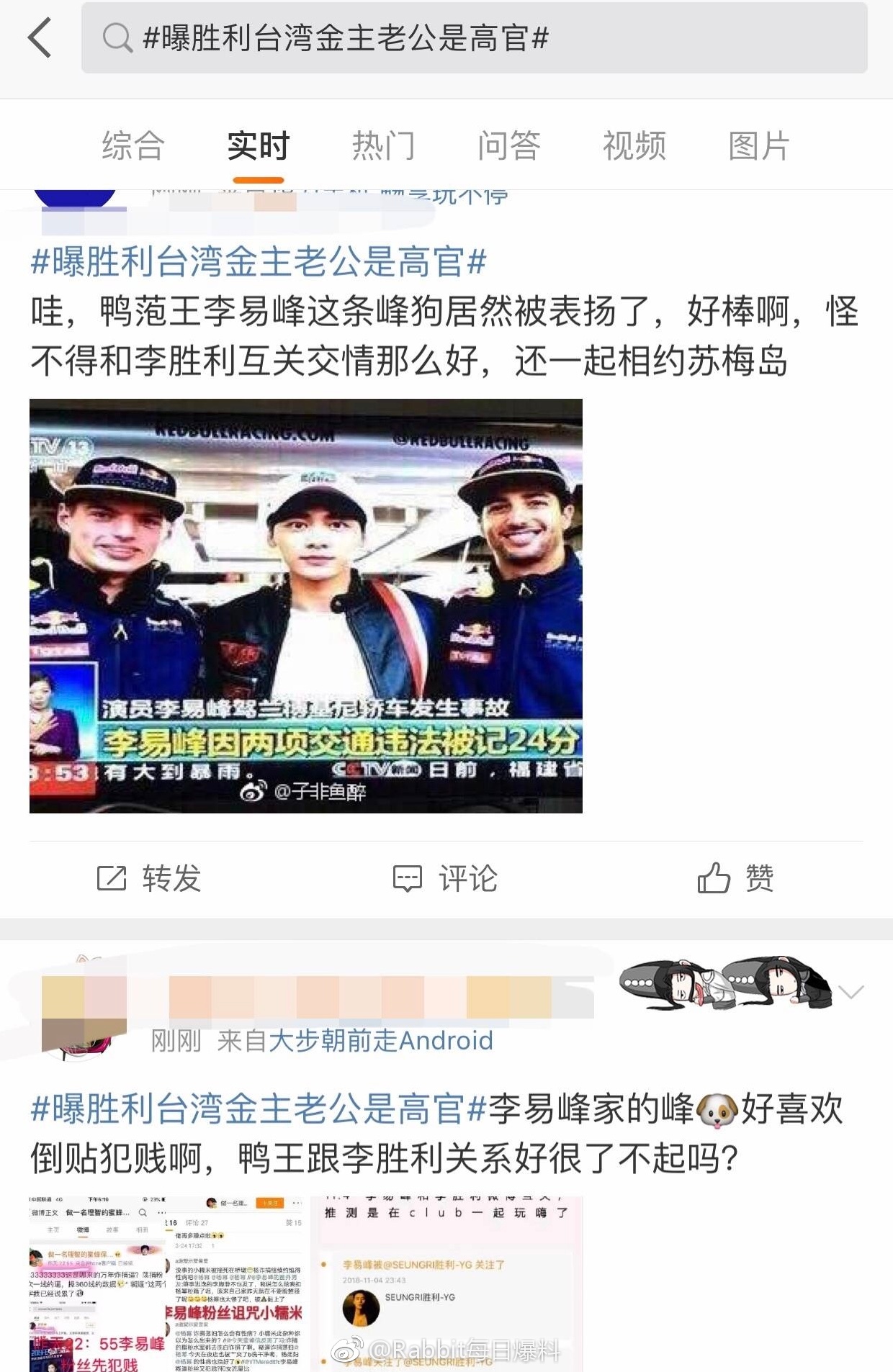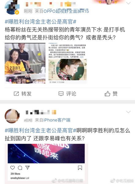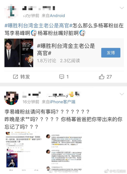 Và vụ việc liên quan đến Seungri vẫn chưa có dấu hiệu dừng lại khi liên tiếp hết người này đến người khác bị khui ra. Mới đây nhất, truyền thông Đài Loan đưa tin kim chủ phía sau Seungri chồng của bà ta là một quan chức cao cấp của giới chính trị thu hút sự đông đảo của mọi người và từ khóa #Tiết lộ kim chủ Đài Loan của Seungri chồng là quan chức cấp cao# đã lên top search weibo. Thế nhưng điều đáng chú ý hơn hết chính là việc dấy lên sự tranh cãi, chiến tranh của fan hai nhà Dương Mịch và Lý Dịch Phong khi chuyện này dường như không liên quan gì đến thần tượng của họ cả.