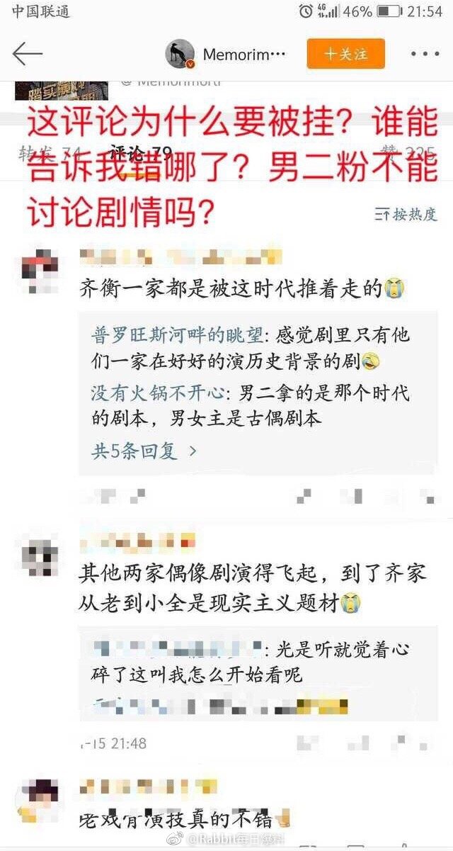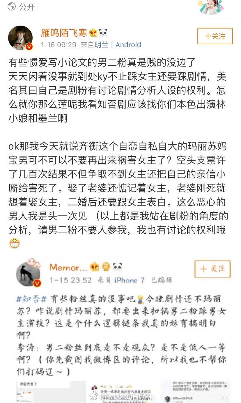 Fan nhà Chu Nhất Long điểm tên fan nhà Triệu Lệ Dĩnh yêu cầu công khai xin lỗi. Thì fan nhà Triệu Lệ Dĩnh đăng weibo cho rằng fan nhà Chu Nhất Long giẫm nữ chính, giẫm luôn tình tiết phim. (Khi fan nhà Chu Nhất Long thảo luận những tình tiết mới, fan nhà Chu Nhất Long thì thấy thương cho nhân vật Tề Hành chịu nhiều cực khổ, không dám xem những tập sau này… thì xảy ra tranh chấp hai bên, fan Chu Nhất Long cho rằng lẽ nào fan nam hai không thể thảo luận tình tiết sao thì fan nhà Triệu Lệ Dĩnh cho rằng nhân vật nam hai chỉ là kẻ tự luyến, tự tư tự đại xuất hiện chỉ làm hại nữ chính: 'Nếu như nói có quyền thảo luận thì tôi cũng thế'….).
