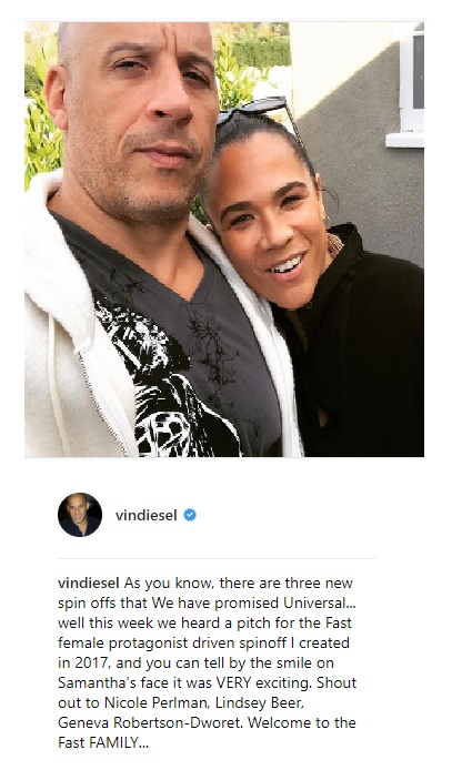 Mới đây Diesel vừa đăng một tấm hình chụp chung với Samantha Vincent, người vừa là chị vừa là sản xuất của thương hiệu Fast & Furious, mà người xem biết được rằng bộ phim ngoại truyện toàn nữ này sắp được sản xuất. Cũng trong bài đăng, anh tiết lộ bộ phim sẽ được những 3 biên kịch khác nhau chắp bút, là Nicole Perlman, Lindsey Beer và Geneva Robertson-Dworet.