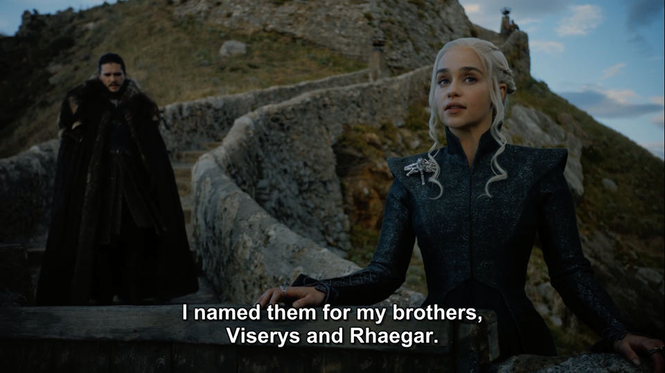 Ở một cảnh sau đó, Jon đã tới gặp riêng Daenerys và được Mẹ Rồng cho phép khai thác những mỏ đá vỏ chai - chất liệu diệt được quỷ Bóng Trắng - trên đảo Dragonstone. Khi cả hai người đứng nhìn ra biển, Daenerys đã nói với Jon về những con rồng, vốn được đặt tên giống tên của hai anh trai mình: Viserys và Rhaegar. Trùng hợp thay, Rhaegar chính là cha đẻ của Jon Snow. Phải chăng trong tương lai, Jon sẽ có mối liên hệ gì đó với con rồng Rhaegal của Daenerys?