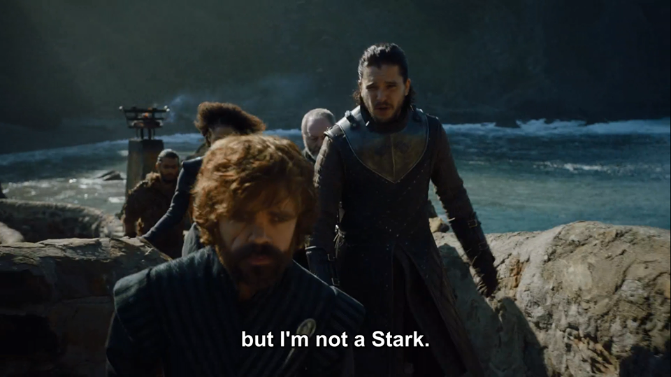 Tuy nhiên Jon Snow hiện giờ lại không có mặt ở Winterfell. Anh đã tới đảo Dragonstone để tìm cách nhờ nữ hoàng Daenerys - thực ra chính là cô ruột bên họ cha của mình - cùng liên minh chống quỷ Bóng Trắng. Trong tập 3 - “The Queen’s Justice”, có rất nhiều chi tiết ẩn dụ về thân thế thực của Jon được lồng vào các cảnh phim. Chẳng hạn, khi Tyrion nói: “Bất cứ khi nào người nhà Stark đi về phương Nam, họ đều gặp rắc rối” thì Jon đã đáp lại: “Điều đó đúng. Nhưng tôi không phải người nhà Stark”. Ngay sau khi nói câu này, anh bị một con rồng của Daenerys bay sượt qua đầu (rồng là biểu tượng của gia tộc Targaryen - gia tộc đằng nội của Jon trên thực tế).