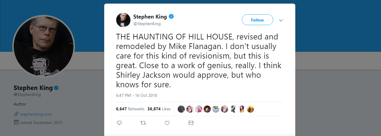Sự chất lượng và thành công của The Haunting of Hill House đã đến tai của nhà văn kinh dị hàng đầu quả đất Stephen King. Cụ thể, ông đã đăng tải dòng trạng thái lên tài khoản Twitter cá nhân, qua đó không tiếc lời khen ngợi cho series tâm linh của Netflix: “Bình thường tôi không để tâm lắm tới mấy vụ chuyển thể này, nhưng phim này thì hay nha! Gần chạm đỉnh cao luôn, thật sự. Tôi nghĩ Shirley Jackson sẽ chịu thôi, nhưng mà ai biết được.”