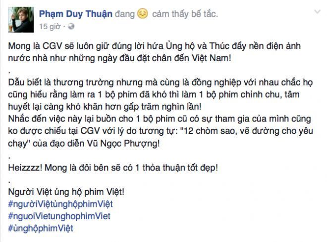 Vụ này, nếu hỏi CGV có sai không, xin thưa không sai. Vì đơn giản đây là một hợp đồng thương mại, nếu hai bên không đồng ý thì không ký kết và làm việc cùng nhau, đến phim khác, khi hai bên vui vẻ thì chúng ta lại làm việc chung, cũng là một thị trường, mỗi người một thế mạnh mà khai thác doanh thu.