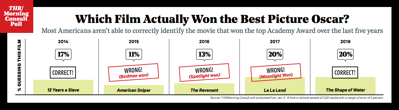 Hóa ra chỉ có 20% số người trong tổng số hơn 2000 người được hỏi nhớ ra quán quân của Oscar 2018 là tác phẩm The Shape of Water của đạo diễn Guillermo Del Toro. Tệ hơn là con số 20% còn là cao nếu so với tỉ lệ trả lời đúng của các câu hỏi khác trong bản khảo sát. Ví dụ như khi được hỏi phim nào thắng giải Phim hay nhất tại Oscar 2017, có tới 20% chọn La La Land trong khi chỉ có 12% có câu trả lời chính xác là Moonlight. Ít nhất chúng ta có thể đổ lỗi cho vụ scandal trao nhầm giải giữa hai phim này tại Oscar lần thứ 89 năm ấy.