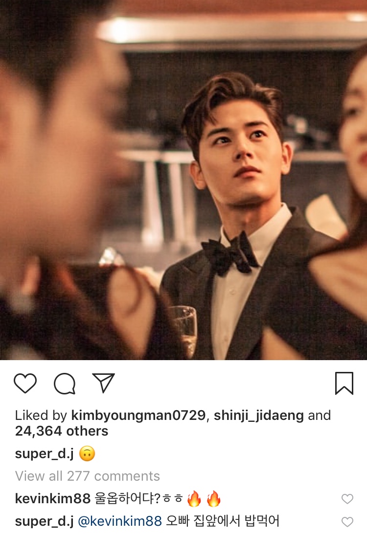 Kevin (ZE:A) bình luận bài đăng của Kim Dong Joon: “Cậu đang khóc hả?”. Nam ngôi sao trả lời: “Ăn cơm ở nhà oppa”.