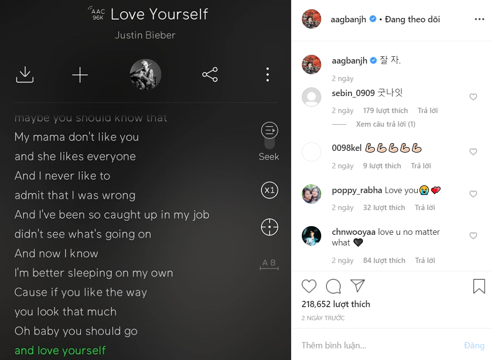 Mới đây, những bài đăng của Ahn Jae Hyun và Goo Hye Sun trên mạng xã hội Instagram đã tập trung sự chú ý từ cư dân mạng. Trở lại ngày 07/07, Ahn Jae Hyun đã đăng tải một bức ảnh chụp màn hình điện thoại ca khúc Love yourself của Justin Bieber kèm theo chú thích: “Ngủ ngon nha”. Trong đó, bài dung bài hát như sau:
