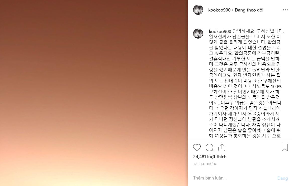 “Xin chào. Tôi là Goo Hye Sun đây ạ. Sau khi đọc được bài viết của Ahn Jae Hyun, tôi cũng chia sẻ bài viết này đến các bạn. Tôi xin giải thích về phần tiền ly hôn. Trong tiền ly hôn có 1 khoản là tiền từ thiện, thay vì tổ chức đám cưới thì số tiền đó toàn bộ được đem đi từ thiện, số tiền đó toàn bộ là của tôi nên giờ tôi muốn lấy lại một nửa. Ngôi nhà của anh ấy ở, tiền nội thất cũng đều do tôi chi trả và 100% công việc gia đình cũng do tôi thực hiện, nên tôi cần nhận lại 30.000 won lao động trong 1 ngày/3 năm. Tiền này không phải là tiền thỏa thuận ly hôn.”