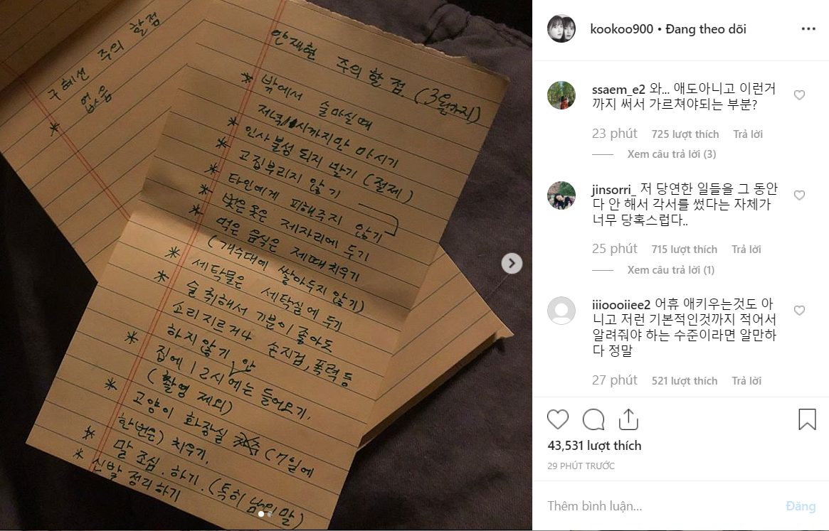 Chỉ uống đến 10 giờ tối (tờ ghi chú có dấu hiệu tẩy xóa, nhìn xa giống 11 giờ) khi ở ngoài đường. Không sử dụng bạo lực. Không làm tổn thương người khác. Không bướng bỉnh. Không la hét ngay cả khi cảm thấy tốt khi say rượu. Về nhà lúc 12h tối, trừ khi bận quay phim. Để quần áo lót đúng nơi quy định. Dọn dẹp vệ sinh cho mèo 7 ngày 1 lần…Trong khi đó, tờ ghi chú của Goo Hye Sun chỉ vọn vẹn hai chữ “Không có”.
