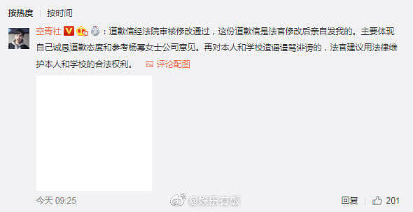 Ngày 18 tháng 4 hôm nay, một tài khoản truyền thông - Không Thanh xã đã gởi thư xin lỗi đến Dương Mịch đồng thời biểu thị: “Bức thư xin lỗi này đã thông qua sự chỉnh sửa của toà án, và được họ đích thân gởi lại cho tôi sau khi đã thông qua chỉnh sửa. Chủ yếu thể hiện bản thân với thái độ xin lỗi thành khẩn cũng như tham khảo ý kiến của phía công ty Dương Mịch”.