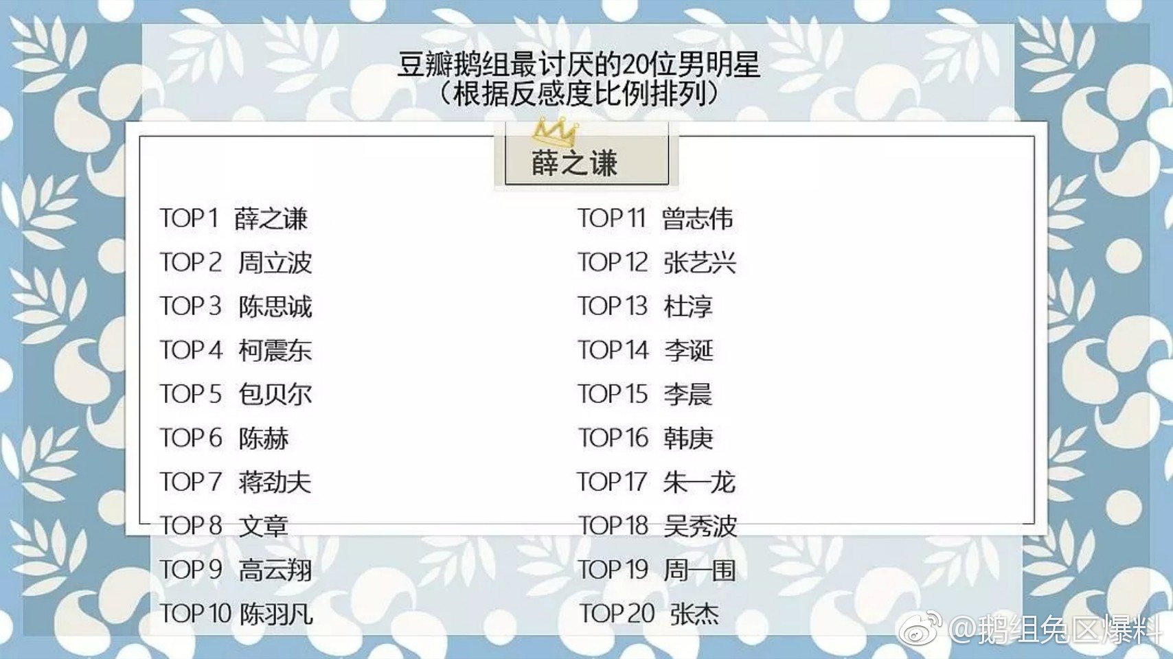 Đứng vị trí thứ nhất trong bảng này là nam ca sĩ, diễn viên, người chế tác âm nhạc - Tiết Chi Khiêm. Tiết Chi Khiêm sinh năm 1983, chính thức bước chân vào ngành giải trí từ năm 2005 sau khi tham gia chương trình tuyển chọn tài năng. Năm 2006, anh ra album đầu tiên mang tên mình Tiết Chi Khiêm. Dù ra nhiều ca khúc hay và đạt được nhiều giải thưởng nhưng đời tư của anh cũng ồn ào không kém khi nhiều lần vấp phải scandal ngoại tình.
