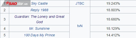 Không những thế, Sky Castle đã vượt qua cả ba bộ phim có rating cao nhất lịch sử đài cáp trước đó chỉ trong 1 tập phát sóng, để vươn lên vị trí số 1 đầy quyền lực. Vào tập 15 lên sóng tối hôm trước rating của SKY Castle là 16.4%, vẫn còn cách rất xa ba bộ phim có rating cao nhất là Mr. Sunshine (tvN) với rating 18.129%, Goblin với rating 18.680% và Reply 1988 (tvN) với rating 18.803%, nhưng hạ gục cả 3 bộ phim cùng lúc thì ít có ai ngờ tới rằng Sky Castle có thể làm được.