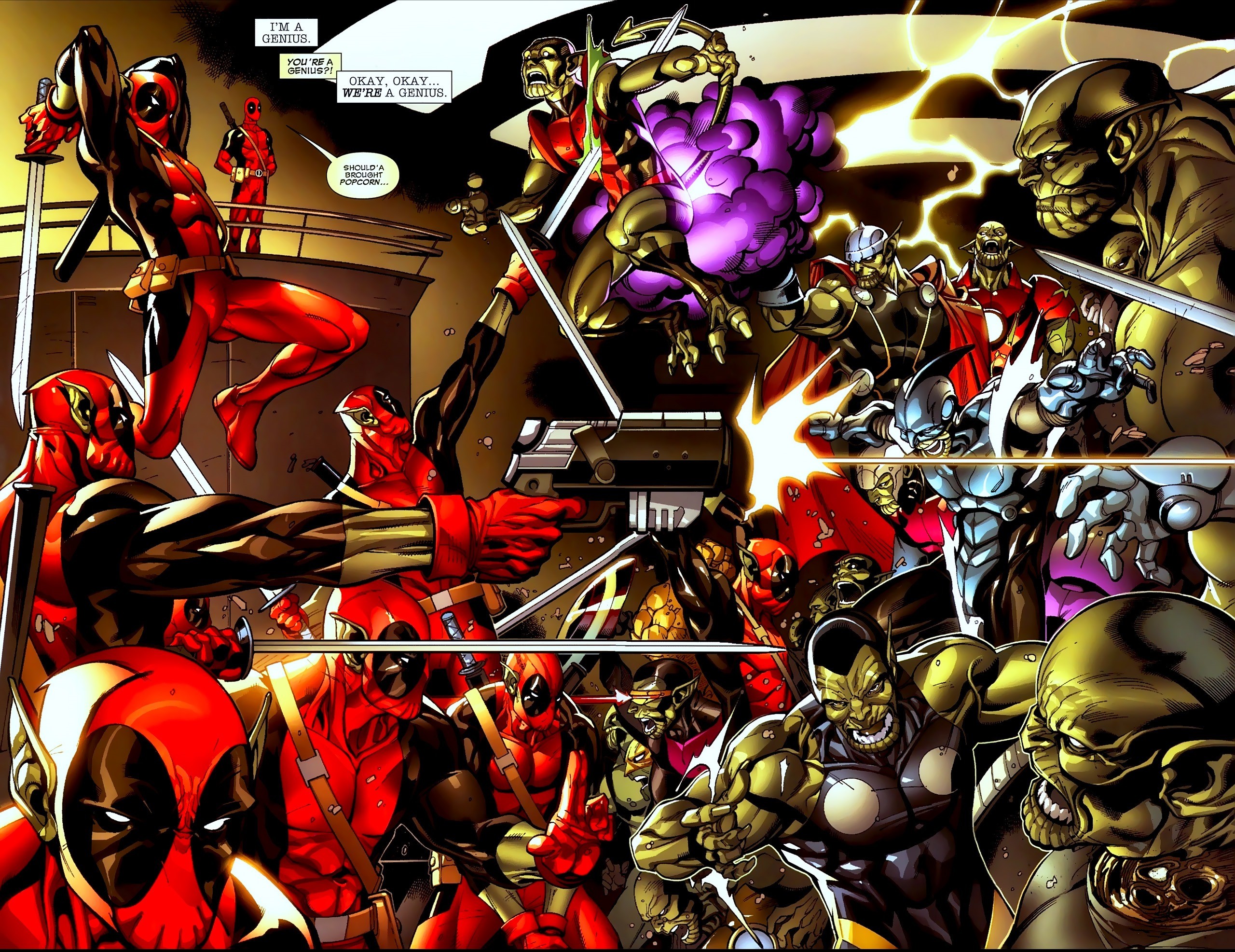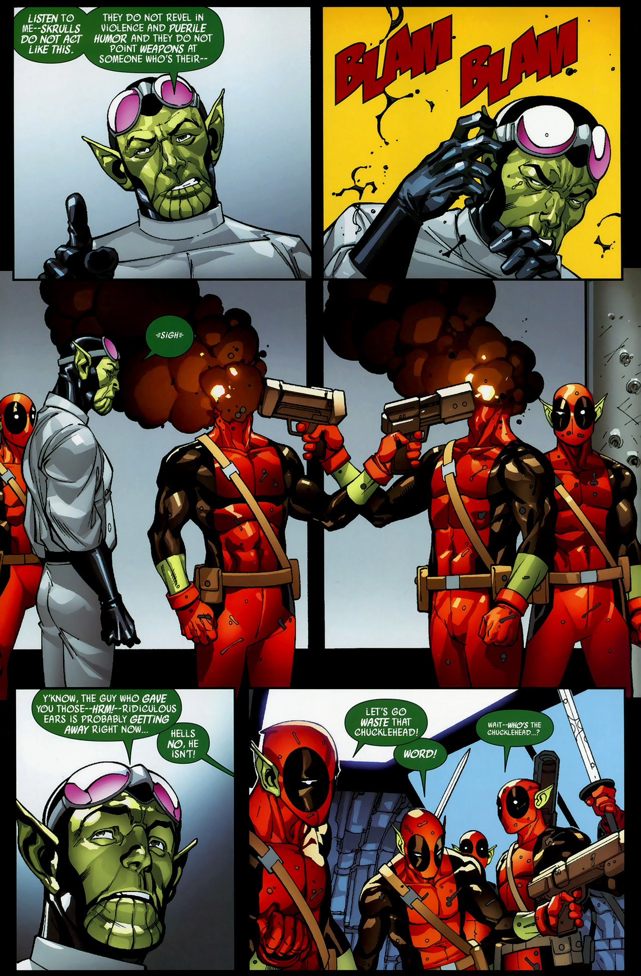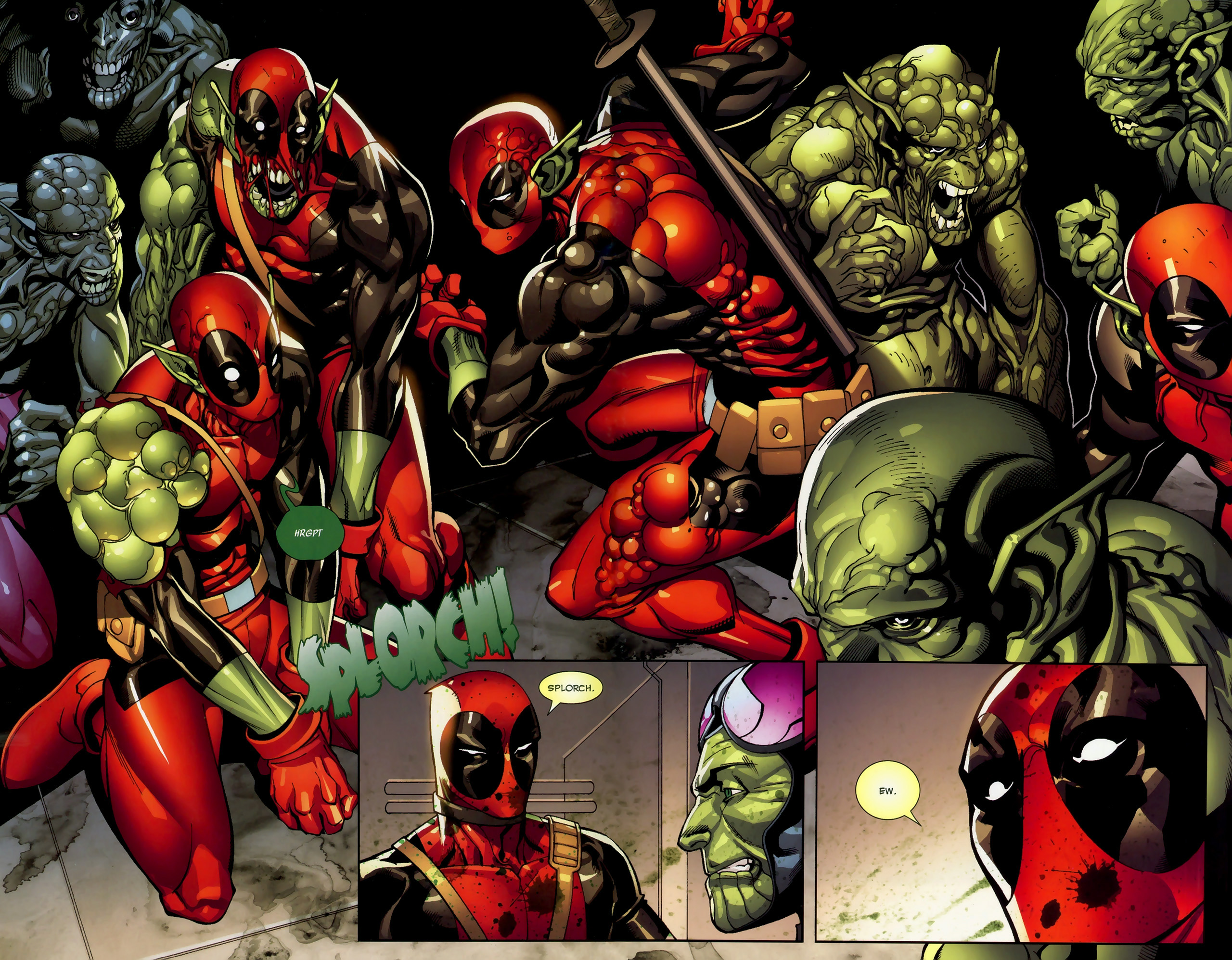 Trong khi đó, nhà khoa học Skrull chịu trách nhiệm tái tạo sức mạnh của Deadpool đang gặp khó khăn trong việc làm dịu đội Skrull-Deadpool. Tất cả những người lính này dường như phải chịu đựng sự điên rồ vốn có của Deadpool cũng như sức mạnh của anh ta, thậm chí đến mức còn cầm súng bắn nổ đầu lẫn nhau. Thật may cho ông ta, những chiến binh này đã tạm thời có thể kiểm soát được trở lại.