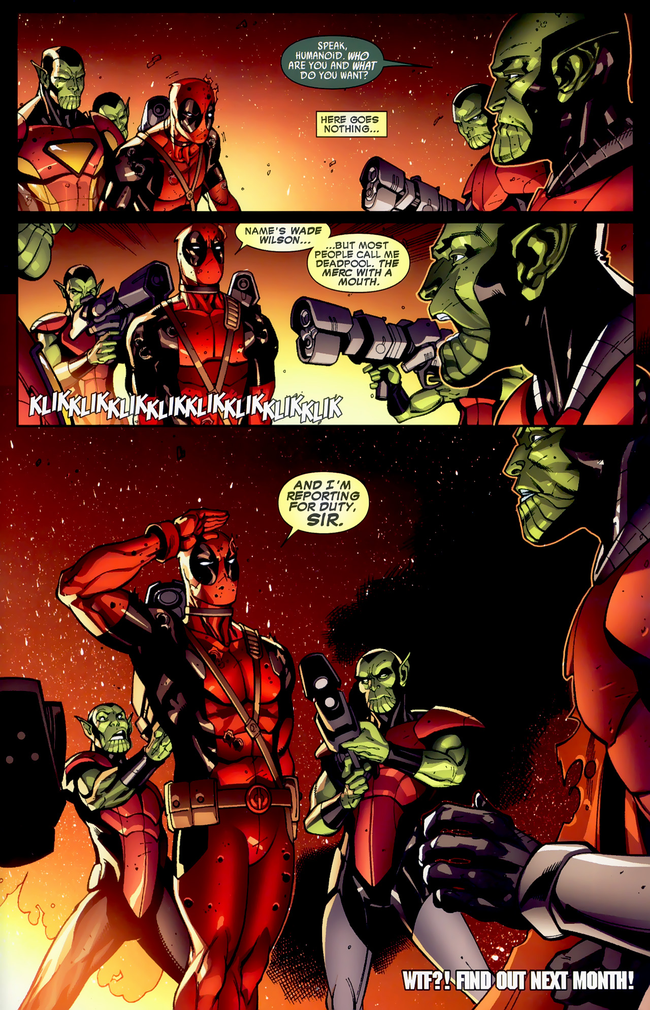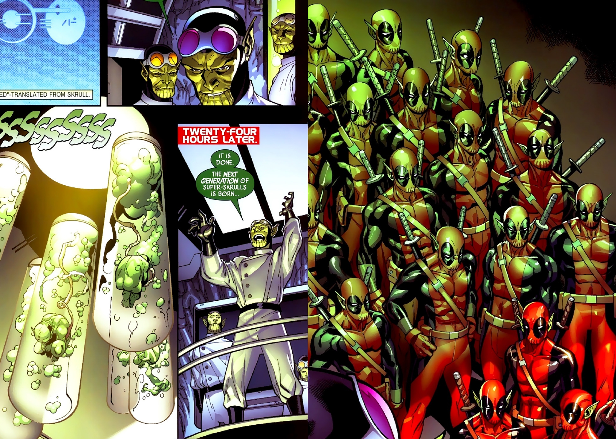 Các nhà khoa học của Skrull đã nhân bản các mẫu máu của Deadpool và sử dụng nó để nâng cấp một phi đội Super-Skrull. Họ cũng chấp nhận bắt tay hợp tác và để Deadpool phụ trách đào tạo những Super-Skrull mới này - một công việc mà Deadpool “có thể” đảm nhận rất tuyệt vời. Tuy nhiên, thay vì huấn luyện họ về chiến thuật chiến đấu thì anh ta lại dùng cái mồm lắm chiêu của mình để khơi gợi sự điên rồ trong họ. Anh ta “điều khiển” Deadpool-Skrull chiến đấu với các Super-Skrull khác và sự hỗn loạn nổ ra trong căn cứ, còn bản thân thì lén đi báo cáo với Nick Fury.