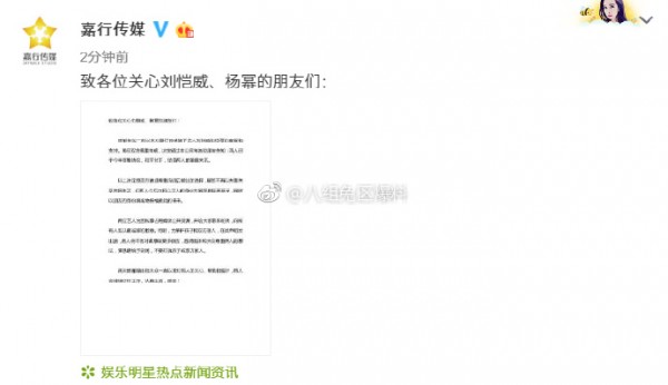 “Cảm ơn mọi người đã luôn yêu quý và ủng hộ Lưu Khải Uy và Dương Mịch - những nghệ nhân của truyền thông Gia Hành. Hai bên sau thời gian suy nghĩ cẩn thận, hôm nay quyết định thông qua công ty chúng tôi muốn thông báo với các vị bằng hữu: Hai người đã ký tên hiệp nghị trong năm nay, chia tay hòa bình, kết thúc mối quan hệ hôn nhân của cả hai.