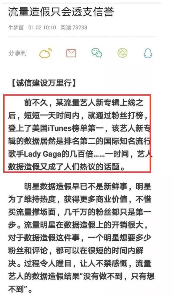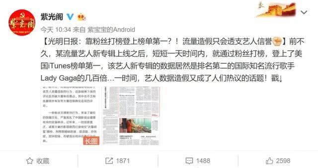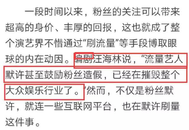 Trong bài báo này của Nhật báo Quang Minh cũng nhắc đến sự việc này, đồng thời còn mượn lời biên kịch Uông Hải Lâm chỉ ra rằng: “Ngôi sao lưu lượng thầm cho phép, thậm chí cổ vũ fan hâm mộ làm giả đã phá hủy toàn bộ ngành công nghiệp giải trí của công chúng”.