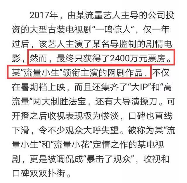 Nhật báo Quang Minh còn chỉ ra rằng, năm 2017, một dự án phim cổ trang do công ty quản lý của một lưu lượng ngôi sao đầu tư sản xuất đã trở thành bom tấn truyền hình của năm. Nhưng chỉ một năm sau, bộ phim điện ảnh do ngôi sao này đóng chính chỉ nhận được doanh số phòng vé là 24 triệu NDT.