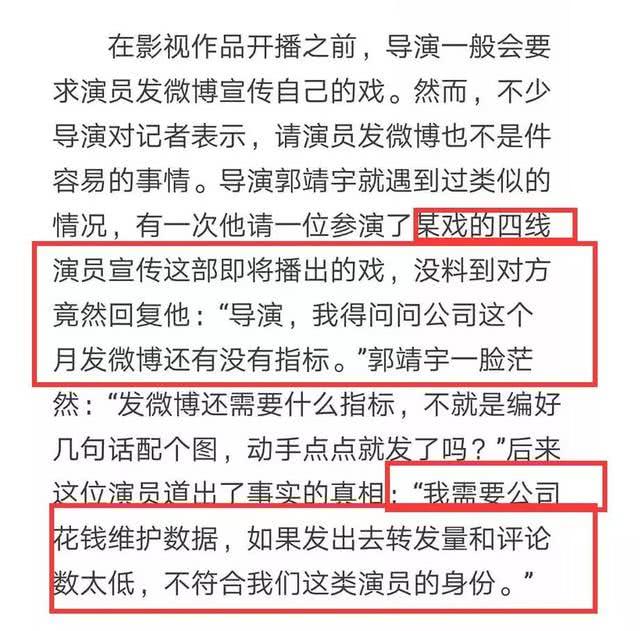 Không chỉ có số liệu của các ngôi sao lưu lượng không chân thực, đến một số diễn viên hạng D hiện nay cũng cần phải xem xét lại. Bởi mỗi một trạng thái đăng tải trên weibo của họ, phía công ty quản lý đều phải bỏ tiền ra để duy trì số liệu. Nếu sau khi đăng đàn mà lượt chia sẻ và số lời bình luận quá thấp thì cũng không phù hợp với thân phận của các ngôi sao.