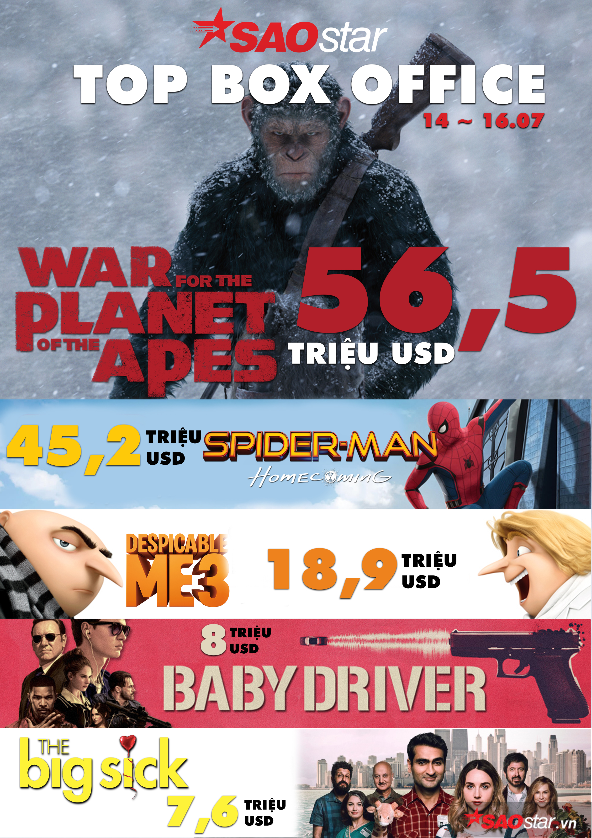Tuy chỉ bằng một nửa so với những gì Spider-man: Homecoming đã làm được vào tuần trước (117 triệu USD), thế nhưng phần 3 của trilogy Planet of Apes cũng đã đã soán ngôi của Người Nhện tại Bắc Mỹ, bởi lẽ sau ấn tượng mở màn kia, Người Nhện tuổi teen đã nhanh chóng sụt giảm phong độ đến hơn 60% khiến cho doanh thu 3 ngày cuối tuần vừa qua chỉ đạt 45,2 triệu USD.