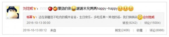 Ngày 12 tháng 9 năm 2015, Lưu Khải Uy chúc Dương Mịch sinh nhật vui vẻ: “Chồng mãi mãi yêu em”. Ngày 13 tháng 10 lúc 12h khuya, Dương Mịch chúc sinh nhật Lưu Khải Uy: “Những lời khác chúng ta từ từ nói với nhau”.