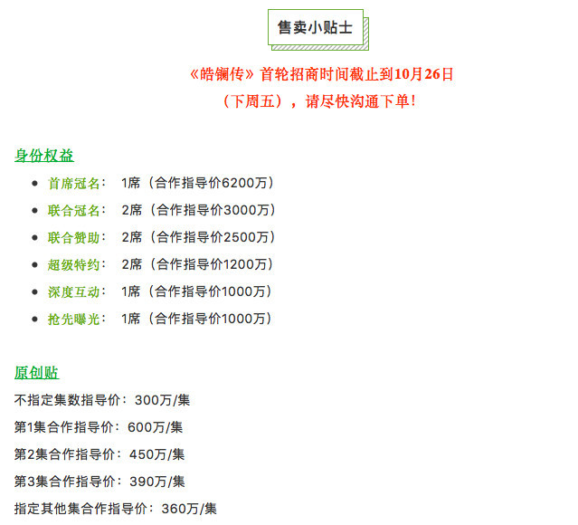 Gần đây có thông tin về giá bản quyền phát sóng phim, từ giá phát sóng phim đến giá để dán quảng cáo trong phim cũng được đưa ra cụ thể cho từng tập phát sóng. Trong đó cao nhất giá phát sóng đầu tiên là 62 triệu NDT.