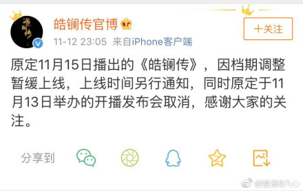 Khi mọi thứ dường như đã chuẩn bị xong thì bất ngờ, trước ngày lên sóng weibo chính thức của đoàn làm phim Hạo Lan truyện đăng lên thông báo: “Hạo Lan truyện vốn định ngày 15 tháng 11 lên sóng nhưng tạm thời sẽ bị hoãn chiếu vì đang điều chỉnh lịch. Thời gian chiếu sẽ thông báo sau. Đồng thời buổi họp báo ngày 13 tháng 11 cũng sẽ bị hủy bỏ. Cảm ơn sự quan tâm của mọi người”.