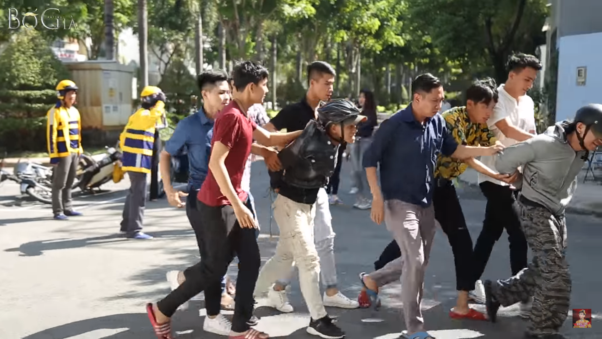 Cảnh hiệp sĩ bắt cướp là một trong những tình huống hấp dẫn trong webdrama Bố già. Bất ngờ nhìn thấy một khách đi xe ôm bị cướp mất túi đồ, bố già (Trấn Thành) đã không ngại nguy hiểm rượt theo 2 tên tội phạm. Bằng sự quả cảm của mình, bố già tông xe thẳng vào chiếc moto, cùng những người dân xung quanh bắt sống kẻ cướp.