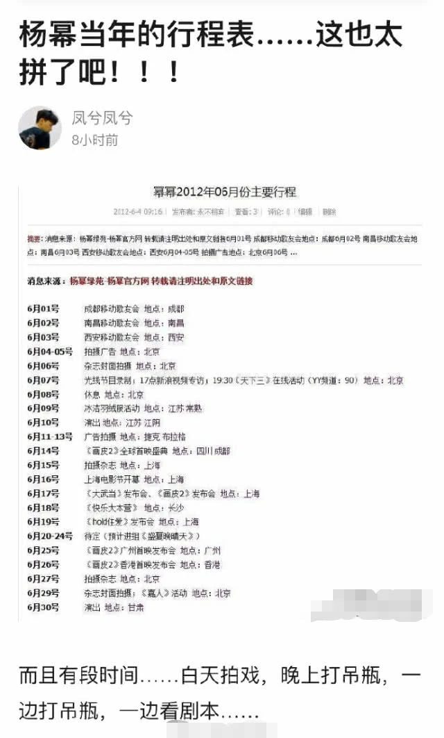 Gần đây, trên mạng lan truyền thông tin lịch làm việc vào 7 năm trước của Dương Mịch, cụ thể là tháng 6 năm 2012. Khi đó Dương Mịch không quá nổi tiếng như bây giờ, cũng chưa kết hôn với Lưu Khải Uy. Nhìn vào thời gian làm việc, dân mạng chỉ biết cảm thán mà thốt lên rằng: “Quá vất vả rồi!“.