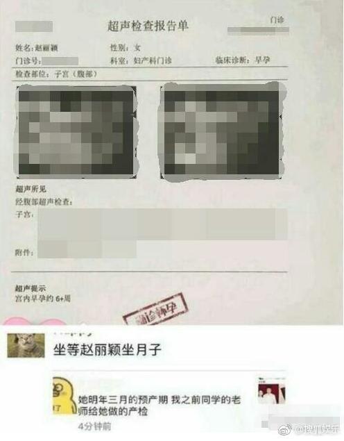 Truyền thông Sina đưa tin ngày 23 tháng 10, theo báo cáo của một truyền thông Đài Loan, sau khi nữ minh tinh Đại Lục Triệu Lệ Dĩnh ngày trước tuyên bố lĩnh chứng kết hôn cùng với Phùng Thiệu Phong, thì những ngày gần đây trên mạng xuất hiện một tấm ảnh cho là “giấy báo cáo kiểm tra siêu âm” của Triệu Lệ Dĩnh dẫn đến nhiều cuộc thảo luận sôi nổi.