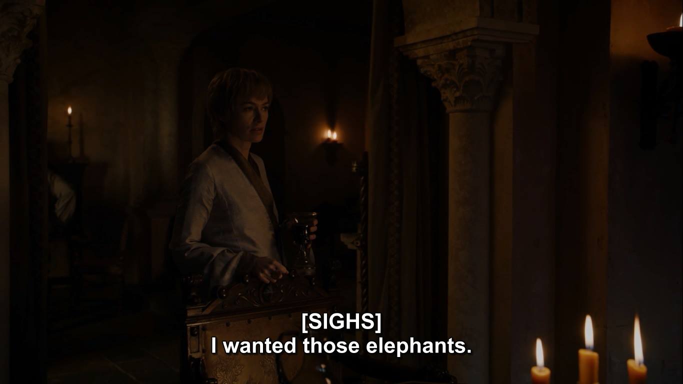 Sự hứng thú đến kỳ lạ của nữ hoàng Cersei với loài vật bản Đôn đã khiến nhiều fan Game of Thrones phì cười. Có người cho rằng, voi vốn là những sinh vật khổng lồ, khi được huấn luyện chiến đấu thì còn đáng gờm hơn nữa, thế nên Cersei mới thèm khát chúng. Mặt khác, Cersei chưa từng thấy voi của Quân Đoàn Vàng khi lâm trận, nên rất có thể ả tin bầy voi này là chìa khóa cho sự lợi hại của đội quân này.