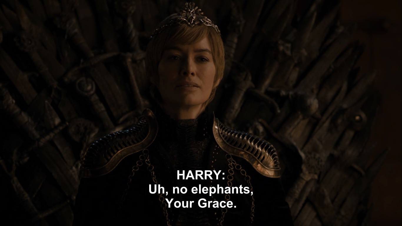 Thậm chí, có fan còn vui tính đùa rằng, sau khi chứng kiến hai con rồng ấn tượng của “Mẹ Rồng” Daenerys Targaryen trong tập cuối mùa 7, Cersei đã háo hức có những con thú đặc biệt của riêng mình. Và trở thành “Mẹ Voi”, nắm trong tay bầy voi chiến do Quân Đoàn Vàng sử dụng chính là đích ngắm của ả. Tuy nhiên, căn cứ vào những tình tiết trong tập đầu của Game of Thrones Season 8, thì có lẽ danh hiệu này sẽ còn ở cách Cersei dài dài.
