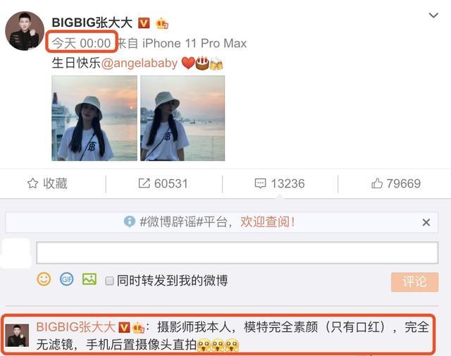 Bài đăng chúc mừng sinh nhật của Huỳnh Hiểu Minh “trống vắng” đến nỗi không hề có một bức hình nào về người vợ của mình. Nhìn sang bài viết của Trương Đại Đại - bạn thân của Angelababy cũng canh đúng 0 giờ để gửi lời chúc mừng sinh nhật kèm theo hai tấm ảnh của nàng tiểu hoa do chính tay anh chụp lại: “Bản thân là người chụp ảnh, cô người mẫu trong hình trang điểm đơn giản (chỉ tô son). Không photoshop, chụp từ camera sau của điện thoại”, nhằm nhấn mạnh vẻ đẹp của cô bạn thân. Xét về sự chân thành, Trương Đại Đại còn tâm lý, chỉn chu hơn cả ông xã của Baby.