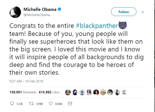 Xin chúc mừng toàn thể ekip Black Panther. Nhờ các bạn, những người trẻ cuối cùng cũng đã nhìn thấy được những siêu anh hùng trông giống họ trên màn ảnh rộng. Tôi yêu tác phẩm này và tôi biết nó sẽ truyền cảm hứng cho tất cả mọi tầng lớp khán giả, để hiểu sâu và tìm thấy dũng khí để trở thành những vị anh hùng trong chính câu chuyện của mình.