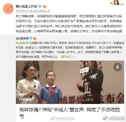 Sau đó phía Dương Mịch lên tiếng thanh minh, đổ lỗi toàn bộ cho Lý Manh - người trung gian nhận tiền nghệ sỹ để ủng hộ cho các quỹ từ thiện, và bảo rằng số tiền quyên góp đều do Lý Manh giữ hết. Thế nhưng buổi trưa hôm đó ngay sau khi phía công ty Dương Mịch lên tiếng, Lý Manh lên tiếng tố cáo: “Trước giờ chưa cầm qua một đồng nào từ bất kỳ minh tinh nào cả”. Cô còn bày tỏ trong quá trình tiếp xúc nghệ sĩ minh tinh, trách nhiệm công việc của cô chỉ là “điều tra nghiên cứu thị trường”, cô thừa nhận bản thân chẳng qua cũng chỉ là “người trung gian cầu nối” giữa nghệ sĩ quyên góp và người được quyên góp.
