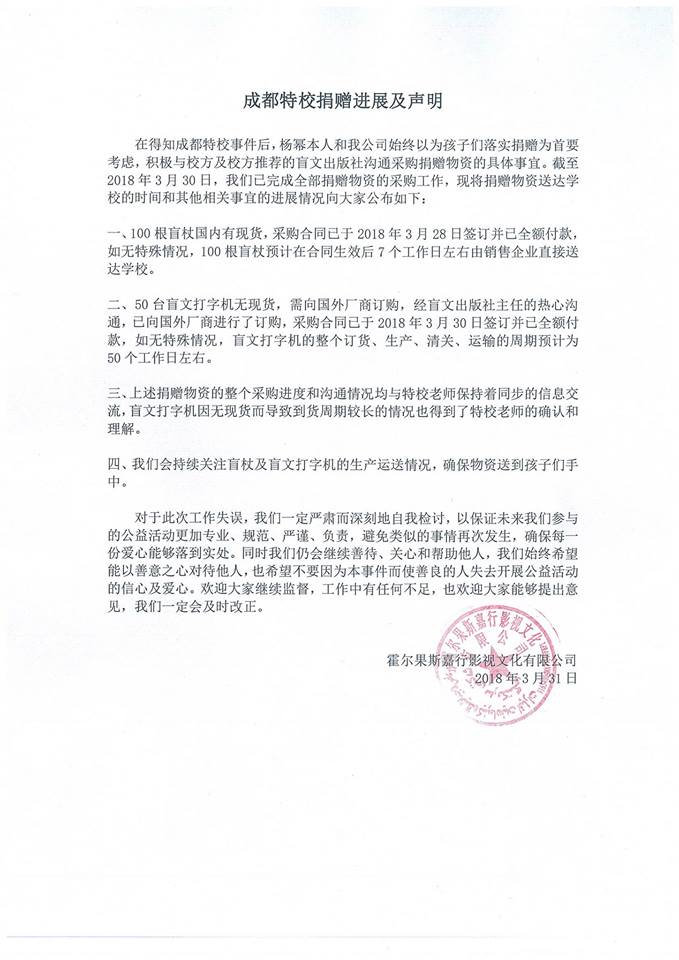 Sáng nay, Gia Hành - Công ty quản lý của Dương Mịch đã đăng thông cáo về việc hoàn thành quyên góp ở Thành Đô. Dương Mịch ngay lập tức chia sẻ bài đăng và bày tỏ cảm xúc: “Lúc biết chuyện này tôi vô cùng sốc và đau khổ, không lên tiếng là vì cảm thấy mình không có tư cách. Dù có vì lý do gì thì bắt bọn trẻ chờ đợi hai năm là sai lầm nghiêm trọng của bản thân tôi và đoàn đội, bất cứ phê bình gì tôi đều tiếp nhận, chỉ có thực sự quyên tặng mới biểu đạt được sự áy náy trong lòng. Mấy ngày nay chúng tôi ra sức thúc đẩy quyên tặng, có tiến triển thực tế mới báo cáo cho mọi người, càng cần phải nói với bọn trẻ: “Thật sự xin lỗi, cảm ơn đã cho chúng tôi cơ hội đền bù, tương lai nhất định càng thêm nghiêm cẩn”.”