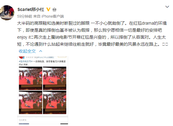Vài tiếng sau sự cố té ngã, Hình Tiểu Hồng liền đăng trạng thái nhằm minh oan cho bản thân mình: “Khi đi thảm đỏ, nếu thật sự bị ngã thì căn bản cũng sẽ bị người khác cho rằng đó chỉ là giả bộ té, trong tình huống như thế tôi tình nguyện tin rằng tất cả đều là sự sắp xếp tốt nhất vậy.”